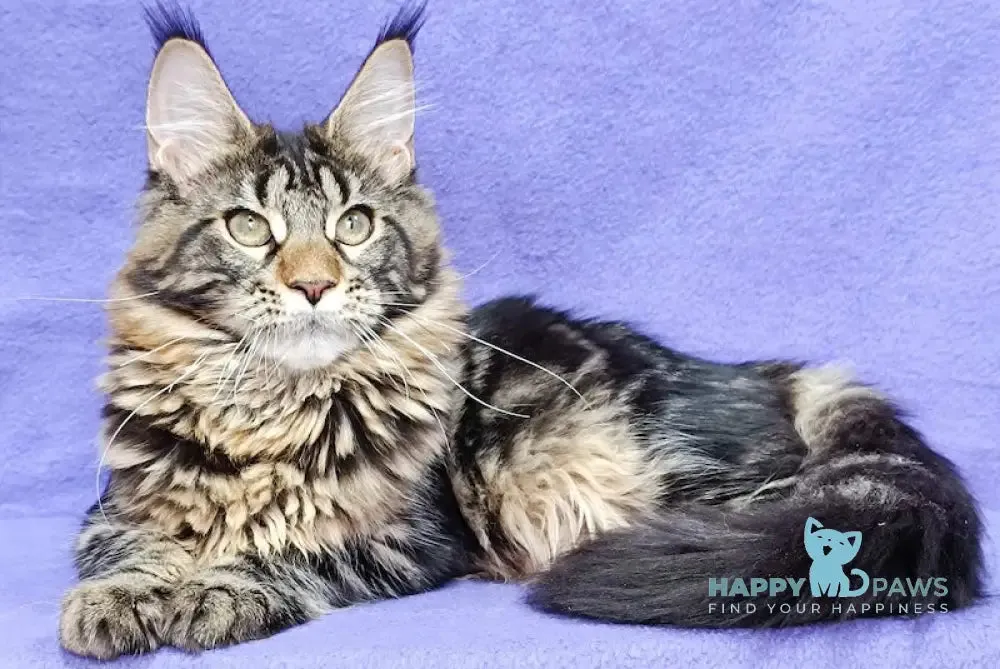 Meet Afina, a beautiful black tabby Maine Coon female kitten. With the unique characteristics of a Maine Coon, she is sure to bring joy and companionship to any home. Gentle and playful, she will make the perfect addition to your family.